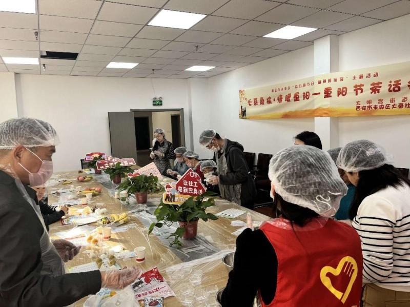 在凤苑社区“心系桑榆·情暖重阳”茶话会上,辖区老年人吃着点心,聊着家常。社区工作人员还为每一位老人准备了重阳糕DIY材料包,组织大家制作糕点,制造舌尖上的“甜蜜”。此外,社区工作人员对老人们送上了祝福,并进行了消防安全、防养老诈骗宣传。