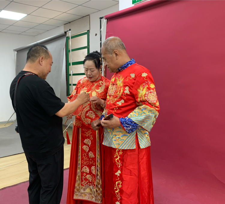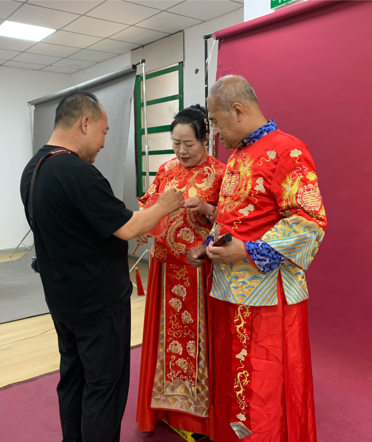 为了提高拍摄质量,满足辖区老年人的选照需求,在社区协商下,摄影团队全天分时段不间断为老年人拍照,每半小时服务一对老年人,试服装、化妆、拍摄、选片整体过程有条不紊,镜头下的老人们慈爱幸福、沉淀出岁月的智慧。