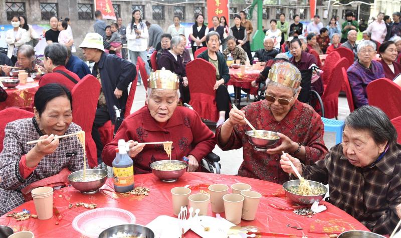 临近中午,英成物业的工作人员把一碗碗热气腾腾的面端上桌,广场上的气氛更加热闹起来,老人们一起吃着面,共迎美好重阳节。