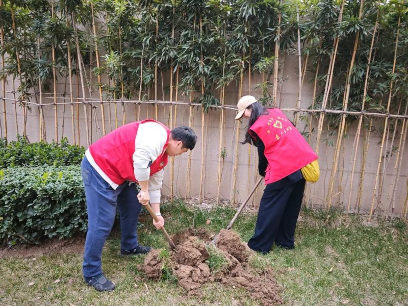 党员志愿者、退役军人志愿者与社区工作人员携手并肩,以实际行动播撒绿色希望,绘就生态新画卷。大家热情高涨,干劲十足。志愿者们分工合作,经过辛勤劳动,一棵棵新栽种的树苗迎风挺立,为小区增添了一抹新绿。
