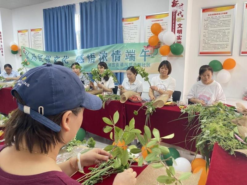 凤鸣贞观社区举办“弘扬民族文化 感悟浓情端午”邻里节活动。活动中,居民齐聚一堂,制作艾草香包和花束。社区还带着粽子、面粉等日用品和艾草花束,上门探访辖区老人。