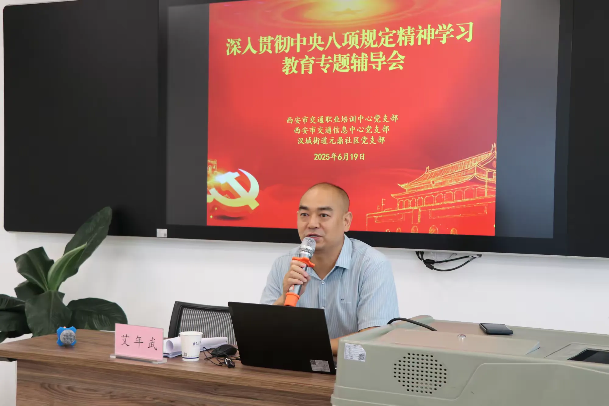 本次学习由在职单位西安市交通职业培训中心领学,支部党员、在职党员、社区两委、社区专职参加,邀请西安市委宣讲团成员、西安市委党校党史党建教研部副主任艾年武教授开展《深入贯彻中央八项规定精神,为新征程提供坚强作风保障》专题辅导。