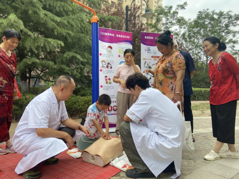 在健康知识普及环节,医护人员借助模拟人道具,现场完整演示心肺复苏流程。从判断环境安全,到拍打双肩呼唤患者;从准确找到按压点,到规范进行胸外按压和人工呼吸,每一个步骤都伴随着详细讲解,确保居民们能够看得清晰、学得扎实。演示结束后,居民们热情高涨,纷纷上前,在医护人员一对一的悉心指导下,亲自上手实践操作。令人惊喜的是,许多小朋友在家长的陪同下也积极参与其中,他们稚嫩的小手在模拟人上认真按压,眼神中满是对生命急救知识的渴望,展现出对守护生命的纯真热忱。