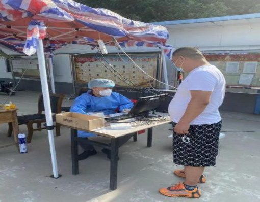 讲武殿北村驻村干部张方参与全员核酸检测工作,发放贴纸并负责身份核验相关工作。