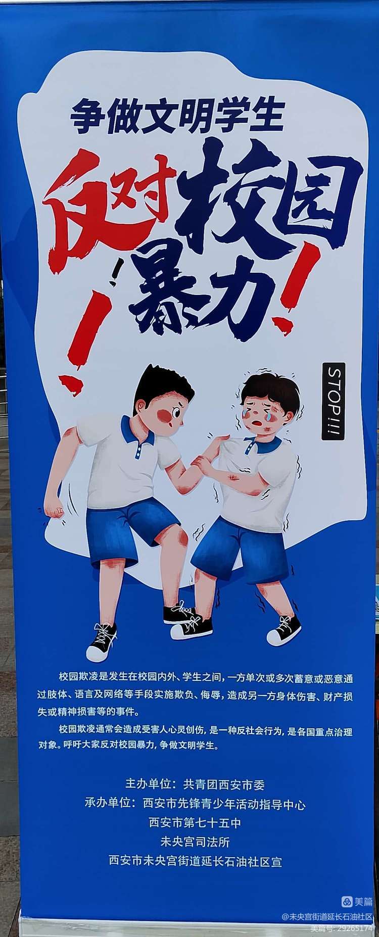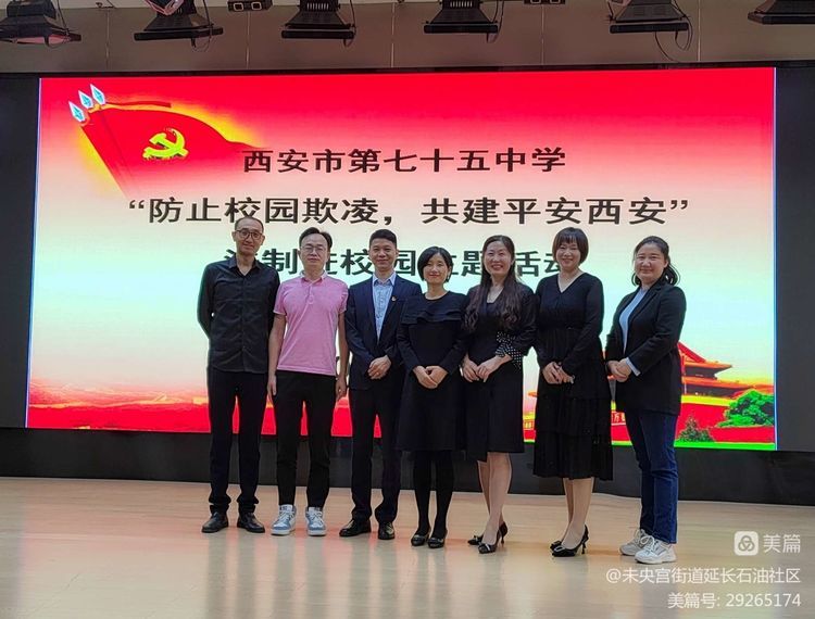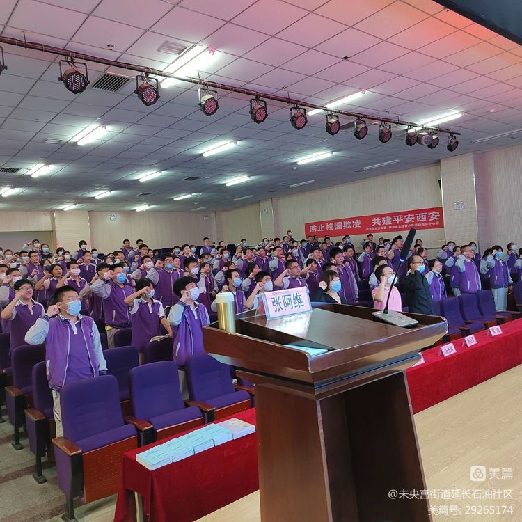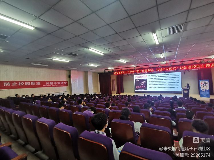 为更好地预防校园欺凌事件的发生,进一步提升学生、老师和家长对校园欺凌现象的正确认知。 2022年9月26日,由共青团西安市委主办、西安市先锋青少年活动指导中心、西安市第七十五中、未央宫司法所、未央宫街道延长石油社区承办的以“防止校园欺凌 共建平安西安”为主题的法律讲座分别走进延长石油小区和西安市第七十五中。讲座邀请国家二级心理咨询师、沙盘辅导师、家庭教育高级指导师张阿维老师主讲,分别针对家长、学生和老师进行了防止校园欺凌的知识分享。