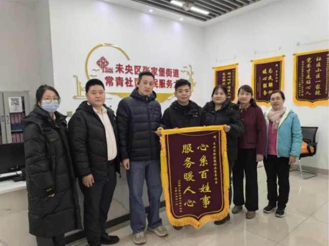 2025年1月7日,张家堡街道常青社区兴乐园小区9号楼业主代表不顾凛冽的寒风来到社区,把一面写着“心系百姓事,服务暖人心”的锦旗送到常青社区,表达自己对社区的一片感激之情。