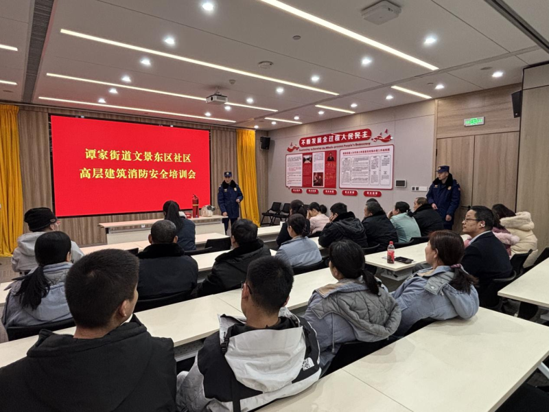 近日,谭家街道文景东区社区联合辖区警务室、物业公司,特邀市消防救援支队特勤大队二站消防员,在社区党群服务中心开展高层住宅防火常识与逃生自救专题培训,社区及物业工作人员、辖区民警、居民及商铺积极参与了活动。