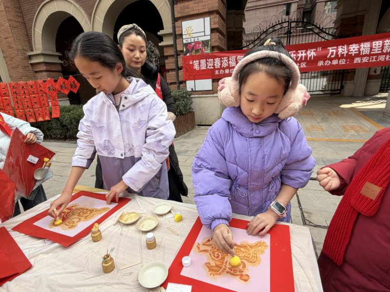 互动游戏区则成为了孩子们的欢乐天地。福字拓印摊位前,孩子们在家长的指导下,亲手蘸取颜料、按压宣纸,一步步完成专属自己的福字作品,认真的模样格外可爱;亲子套圈现场更是热闹十足,家长和孩子们默契配合,瞄准目标、轻轻一抛,每一次成功套中都能引来阵阵欢呼,欢呼声、喝彩声此起彼伏,在趣味互动中,亲子感情愈发浓厚,也套住了满满的幸福与欢乐。