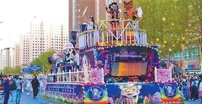 | 傍晚时分,青海西宁市城北区豹街开启花车巡游。 本报记者 曹继炜摄 |