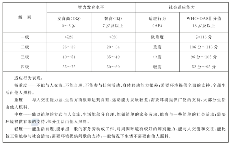 按0~6岁和7岁及以上两个年龄段发育商、智商和适应行为分级。0~6岁儿童发育商小于72的直接按发育商分级,发育商在72~75之间的按适应行为分级。7岁及以上按智商、适应行为分级;当两者的分值不在同一级时,按适应行为分级。WHO-DASⅡ分值反映的是18岁及以上各级智力残疾的活动与参与情况。智力残疾分级见表。