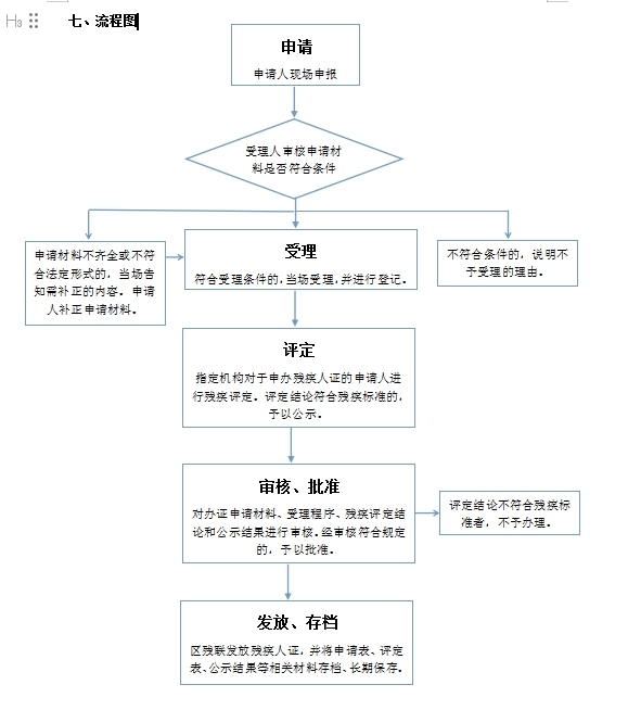 (一)申请:由残疾人本人或其法定监护人,携带申请人身份证、户口本(含西安市未央区有效居住证)原件及复印件前往户籍所在街道办事处(或社区居委会、村民委员会)提出申请领取《中华人民共和国残疾人证申请表》(简称“申请表”)、《中华人民共和国残疾评定表》(简称“评定表”)。 (二)受理:社区居委会、村民委员会接到办证申请人提交的申请材料后,由受理人对申请人、法定监护人、照片、身份证、户口本进行确认,并指导《残疾人证》申请人或监护人如实、完整、规范填写《申请表》和《评定表》中的相关内容。 (三)评定:申请人携带《申请表》、《评定表》、身份证、户口本(含西安市未央区有效居住证)原件以及相关既往病史诊断证明、病例资料到指定残疾评定机构进行残疾评定,定点医院评定医师如实填写残疾评定结果,签字并加盖印章。残疾评定结束后将资料交回社区,经社区居(村)委会进行为期5个工作日的公示。公示结束无异议的,由社区居民委员会、村民委员会出具公示结果证明;精神、智力和未成年残疾人无需进行公示,但社区居民委员会、村民委员会需在《申请表》指定位置签字盖章进行确认。 (四)审核、批准:残疾评定和社区公示结束后,将所需资料统一递交至街道残联,街道残联集中递交未央区政务综合服务中心。区残联对办证申请材料、受理程序、残疾评定结论和公示结果进行审核。经审核符合规定的,予以批准,将残疾人证相关信息录入残疾人基础信息库,打印《残疾人证》并加盖区残联钢印及公章。评定结论不符合残疾标准者,不予办理。 (五)发放、存档:区残联发放残疾人证,并将申请表、评定表、公示结果等相关材料存档、长期保存。通知残疾人本人或其家属携带身份证及户口本原件前往户籍所在的街道残联领取残疾证。 注:持《陕西省居住证》、户籍在外省外市的残疾人的残疾证由户籍地残联负责审核并制发残疾人证。 |