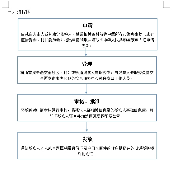 (一)申请:由残疾人本人或其法定监护人,携带相关资料前往户籍所在街道办事处(或社区居委会、村民委员会)提出申请领取并填写《中华人民共和国残疾人证申请表》。 (二)受理:将所需资料递交至社区(村)或街道残疾人专职委员,由残疾人专职委员提交至西安市未央区政务综合服务中心残联窗口工作人员。 (三)审核、批准:区残联对申请材料进行审核,将残疾人证相关信息录入残疾人基础信息库,打印《残疾人证》并加盖区残联钢印及公章。 (四)发放:通知残疾人本人或其家属携带身份证及户口本原件前往户籍所在的街道残联领取残疾证。 注:持《陕西省居住证》、户籍在外省外市的残疾人的残疾证由户籍地残联负责审核并制发残疾人证。 |