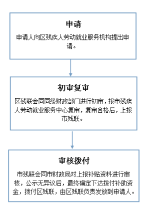 1.申请:符合申报条件的就业特别困难残疾人,按要求提供相关申报材料,向本人户籍所在地区残疾人劳动就业服务机构进行申报。 2.初审复审:区残联会同同级财政部门进行初审,报市残疾人劳动就业服务中心复审,复审合格后,上报市残联。 3.审核拨付:市残联会同市财政局对上报补贴资料进行审核,公示无异议后,最终确定下达拨付补助资金,拨付区残联,由区残联负责发放到申请人。 |