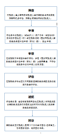1.筛查:残疾人专职委员采取入户或集中访问等方式,对照《西安市残疾人基本辅助器具适配补贴目录》《西安市残疾儿童少年基本辅助器具适配补贴目录》,对残疾儿童少年和持证残疾人进行辅助器具需求摸底筛查和初步评估,筛查出有辅具需求的残疾人。 2.申请:符合条件的残疾人(或监护人)持户口本(或身份证)原件到所在社区(村)或区残联领取《西安市残疾人辅助器具适配补贴申请(审批)表》,提出申请。 3.审核:区县残联对申请资料进行审批,并在《西安市残疾人辅助器具适配补贴申请(审批)表》上签字盖章,不符合救助条件的向申请人说明原因。 4.评估:需要接受辅助器具适配服务的救助对象,持《西安市残疾人辅助器具适配补贴申请(审批)表》由所在区残联组织专业团队进行评估。评估人员根据《西安市辅助器具指导目录》提出评估适配建议。对于行动不便或地处偏僻地区的残疾人,可由区残联组织评估机构入户或集中进行评估。 5.适配:评估通过后,由各街道残联和各社区残疾人专职委员配合辅助器具服务机构在规定的时间内向残疾人提供辅助器具适配服务。 6.回访:辅助器具交付残疾人使用3个月内进行回访。区残联按照《西安市残疾人辅助器具适配补贴回访登记表》,组织基层工作人员对残疾人使用辅助器具的效果进行回访(回访率需达 50%)、征询意见、协调后续服务,做好回访记录。 |