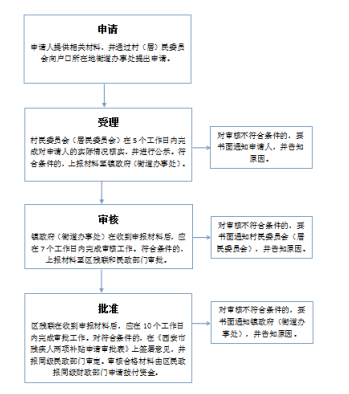 (一)申请:申请享受残疾人两项补贴的残疾人须提供相关书面材料,并通过村(居)民委员会向户口所在地街道办事处提出申请。 (二)受理:村民委员会(居民委员会)在5个工作日内完成对申请人的实际情况核实,并将初审合格的申请人情况在村务公开栏或居委会公开栏公示不少于5天。对无异议的,在《西安市残疾人两项补贴申请审批表》上签署意见,连同其它申报材料一并报镇政府(街道办事处)审核。对审核不符合条件的,要书面通知申请人,并告知原因。 (三)审核:镇政府(街道办事处)要依托城乡社区社会救助服务窗口,按照“一门受理、协同办理”原则,受理残疾人两项补贴申请并做好服务工作。镇政府(街道办事处)在收到申报材料后,应在7个工作日内完成审核工作。对符合条件的,在《西安市残疾人两项补贴申请审批表》上签署意见,连同其它申报材料一并报区残联和民政部门审批。对审核不符合条件的,要书面通知村民委员会(居民委员会),并告知原因。 (四)批准:区残联在收到申报材料后,应在10个工作日内完成审批工作。对符合条件的,在《西安市残疾人两项补贴申请审批表》上签署意见,并报同级民政部门审定。审核合格材料由区民政报同级财政部门申请拨付资金。对审核不符合条件的,要书面通知镇政府(街道办事处),并告知原因。 |