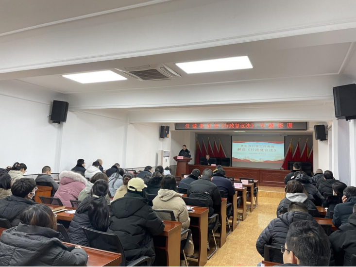 本次培训邀请汉城街道政府法律顾问、陕西端木律师事务所赵涛律师,围绕行政复议的本质、行政复议立法目的解读、行政复议的范围、行政复议案件的一般处理、行政复议决定的执行等五个方面,从街办日常工作角度为机关干部详细解读了新《中华人民共和国行政复议法》,使全体机关干部、行政执法人员对新修订行政复议法、行政复议有关原则和要求、复议程序等方面内容有了深入地了解和认识,进一步提升了基层干部运用法治思维和法治方式化解矛盾、维护稳定、规范执法的能力。汉城司法所负责人强调要做到坚持“关键少数”带头学、机关人员全面学、行政执法人员重点学,不断提升队伍专业化、职业化能力,持续推进街道法治政府建设。培训现场为参会人员发放新修订《中华人民共和国行政复议法》80余份。