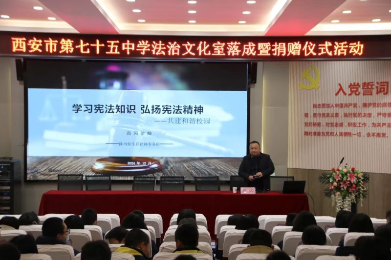 为深入学习践行习近平法治思想,大力弘扬社会主义法治文化,进一步开展青少年普法教育及法治文化基地建设工作,持续推动“八五”普法走深走实,由未央区司法局、区教育局共同发起,辖区优秀律所、律师积极响应,在西安市第75中学建成全区首家,位于校园内的多功能青少年法治教育阵地——75中法治文化室,并于12月19日下午,在该校举行75中法治文化室落成暨捐赠仪式。区司法局主要负责同志,区教育局、区检察院、区关工委、团区委分管负责同志及11家律所代表参加。