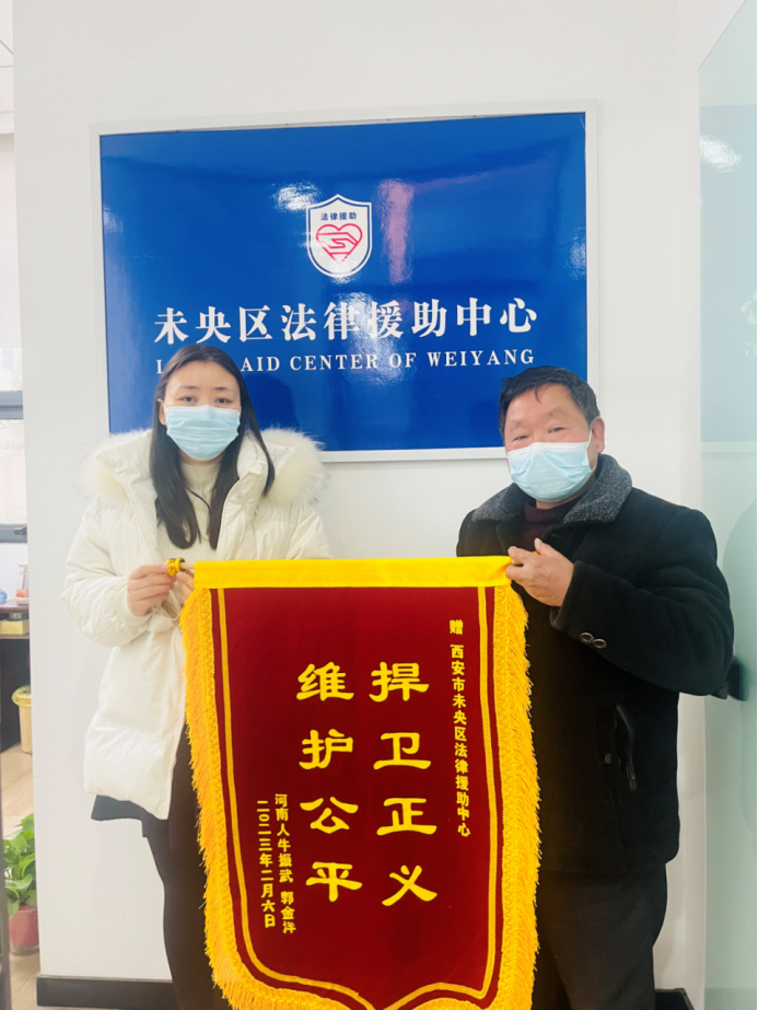 2023年2月21日,牛某来到未央区法律援助中心,特意送上了一面写有“维护公平,捍卫正义”的锦旗,对法援中心为他提供的帮助表示由衷地感谢。