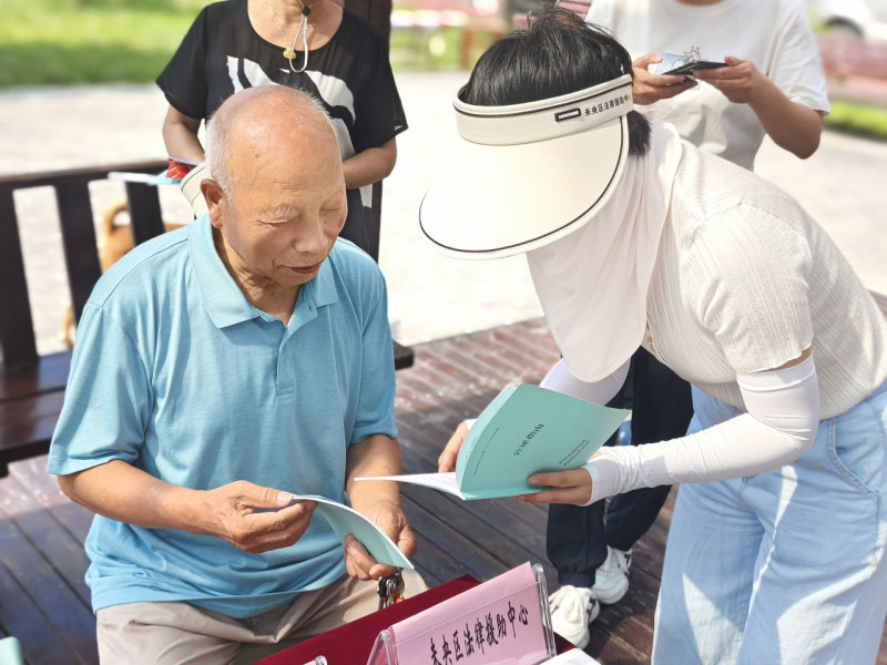 “叔叔,您刚刚说要进行财产公证,我来给您说一下办事流程!”“大爷大妈,这是习近平法治思想和民法典知识手册,你刚说的高空抛物问题,这里面都写着呢,这儿还有一些小礼品,都给您装好了!”,工作人员们与社区居民一边聊着家常、一边普及法律知识和办事流程,现场送出包含普法资料及印有习近平法治思想“十一个坚持”的原创小扇子、遮阳帽、冰袖等夏日特色“普法大礼包”100余份,让法治清风吹入了居民朋友心中。