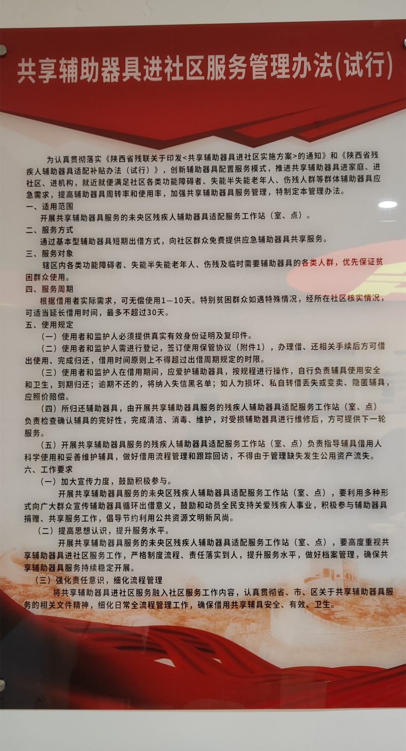 未央区为进一步推进和完善全区残疾人辅助器具适配服务体系建设,促进辅助器具服务健康、持续发展,在指导街道加快辅助器具服务室建设的同时,在十个街道各选了一个试点社区开展辅助器具服务点建设。