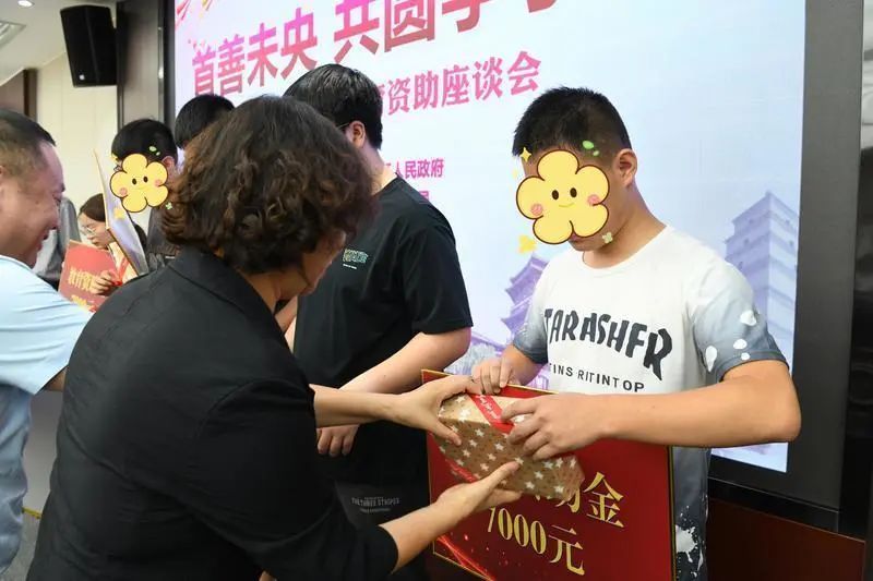 座谈现场,未央区为5名困难学子每人发放了7000元的教育资助金,与会的爱心企业——未央区环保志愿者协会、西安道合力展广告有限公司、西安午后生活品牌运营管理有限公司,为学生们捐赠了书籍和行李箱等爱心物资。
