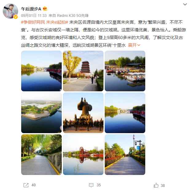 网友们聚焦未央城市发展变化,以短视频、图文微博等形式分享与转发“我眼中的未央”覆盖新浪微博网民2000万+,开设的微博话题#争做好网民 未央e起拍# 阅读量达2286.4万,千余人次参与话题讨论。