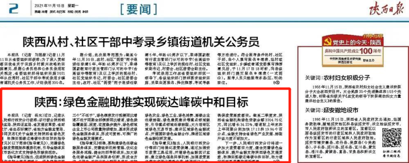 昨天,陕西日报刊发文章《陕西:绿色金融助推实现碳达峰碳中和的目标》。陕西已从省级层面完善绿色金融政策框架和激励机制,引导金融体系以市场化方式支持绿色投融资活动。