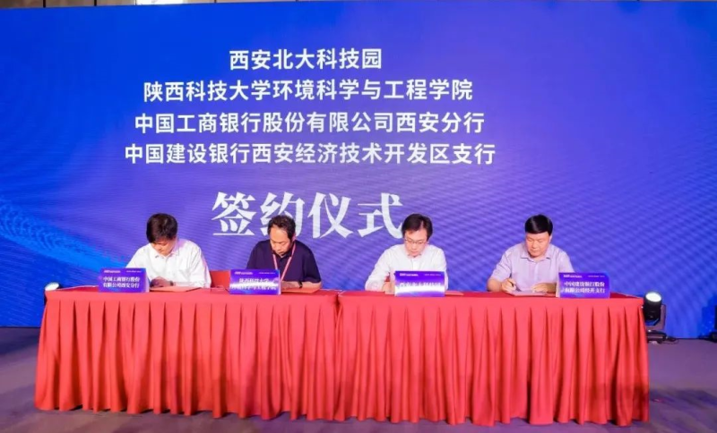在今年6月举办的2021未央区数字经济与“双碳战略”融合发展论坛上,陕西科技大学环境科学与工程学院、西安北大科技园、工商银行西安分行、建设银行西安经开支行在多方见证下共同进行企业高校银行共建共享平台签约仪式,让绿色产业项目项目落地得到专项资金扶持。