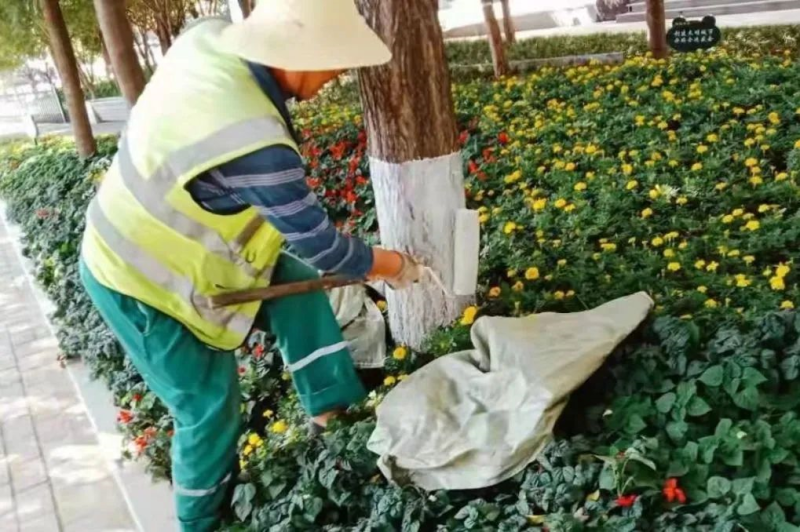 首先是对行道树进行刷白,保护树木在休眠期不被害虫病菌啃食伤害,同时达到防冻害保温作用,让树木过冬增添一份稳妥的安全保障,目前全区已累计完成2500余株树木刷白工作。