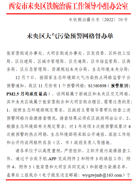 12月7日我区接到大气污染网格预警的通知后,按照省生态环境厅《关于做好2022年11月份大气热点预警网格整改工作的通知》(陕环办发〔2022〕137号)有关要求,我区主要领导高度重视,召开专题会议安排部署,同时制定专项工作方案并组织对被预警区域开展排查,确保辖区PM2.5浓度降到最低,现将近期排查整改情况报告如下: