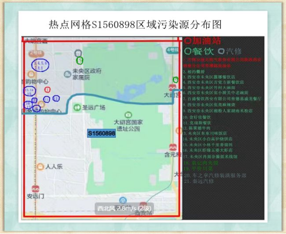 该预警网格属于新城区、未央区、曲江新区、莲湖区4区交叉网格,初步分析本网格预警原因:一是网格周边道路太华路、未央路、北二环路等主干道路车流量大,道路拥堵较严重,造成机车尾气短时聚集、不易扩散;二是扩大巡查发现,个别曲江大明宫保护办工地覆盖不全、湿法作业落实不到位,易产生扬尘污染。