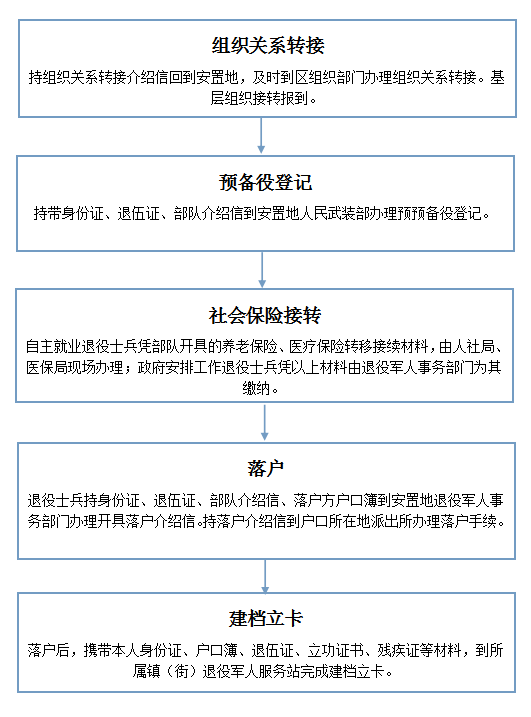 (一)档案转移:退役士兵所在部队应当按照国家档案管理的有关规定,在士兵退役时将其档案及时移交安置地县级以上人民政府退役士兵安置工作主管部门。主要是组织行为,但个人要及时了解档案的管理要求和去向。 (二)组织关系转接:退役前是预备党员、正式党员或共青团员的,退役时部队政治机关会开具相关组织关系转接介绍信,发到个人手中。回到安置地,要及时到区组织部门办理组织关系转接。基层组织接转报到。 (三)预备役登记:持带身份证、退伍证、部队介绍信到安置地人民武装部办理预备役登记。 (四)社会保险接转:自主就业退役士兵凭部队开具的养老保险、医疗保险转移接续材料,由人社局、医保局现场办理;政府安排工作退役士兵凭以上材料由退役军人事务部门为其缴纳。 (五)落户:退役士兵持身份证、退伍证、部队介绍信、落户方户口簿到安置地退役军人事务部门办理开具落户介绍信。持落户介绍信到户口所在地派出所办理落户手续。 (六)建档立卡:落户后,携带本人身份证、户口簿、退伍证、立功证书、残疾证等材料,到所属镇(街)退役军人服务站完成建档立卡。 |