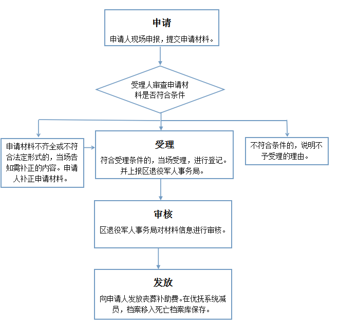(一)申请:申请人持身份证、户口簿等相关材料向户籍所在街道退役军人服务站(或社区、村退役军人服务站)提出申请。 (二)受理:街道办事处(或社区居委会、村民委员会)核查申请材料,符合条件的,上报区退役军人事务局。对不符合条件的,告知申请人不予受理由。 (三)审核:区退役军人事务局接到申请人提交的申请材料后,由受理人对材料信息进行审核,符合要求的发放丧葬补助费。 (四)发放:由区退役军人事务局向申请人发放丧葬补助费。在优抚系统减员,档案移入死亡档案库保存。 |