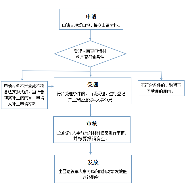 (一)申请:申请人持身份证、户口簿等相关材料向户籍所在社区、村退役军人服务站提出申请。 (二)受理:各级退役军人服务站核查申请材料,符合条件的,上报区退役军人事务局。对不符合条件的,告知申请人不予受理由。 (三)审核:区退役军人事务局接到申请人提交的申请材料后,由受理人对材料信息进行审核并核算报销资金。 (四)发放:由区退役军人事务局向优抚对象发放医疗补助金。 |