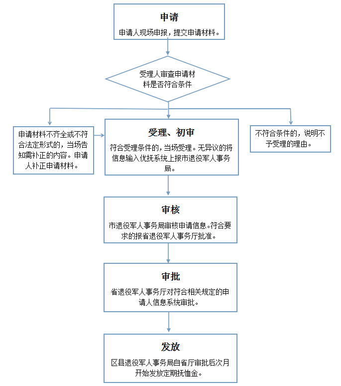 (一)申请:申请人持个人身份证,户口簿,烈士证明书、军人因公牺牲证明书或军人病故证明书,本人与烈士关系证明及申请书等相关材料向户籍所在社区、村退役军人服务站提出申请。 (二)受理:各级退役军人服务站核查申请材料,符合条件的,上报区退役军人事务局。对不符合条件的,告知申请人不予受理由。 (三)初审:区退役军人事务局组织专人审查材料并调查核实,对符合相关规定的申请人,将信息输入优抚系统上报市退役军人事务局。 (四)审核:市退役军人事务局审核申请信息,对符合相关规定的申请人,系统审核上报省退役军人事务厅。 (五)审批:省退役军人事务厅对符合相关规定的申请人信息系统审批。 (六)发放:区退役军人事务局自省厅审批后,向申请人发给《定期抚恤金领取证》,并于次月开始发放定期抚恤金。 |