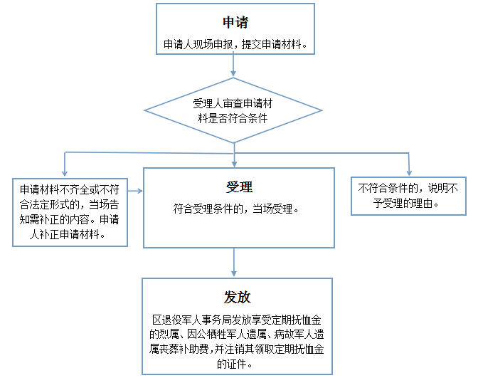 (一)申请:申请人持相关材料向户籍所在街道退役军人服务站(或社区、村退役军人服务站)提出申请。 (二)受理:街道退役军人服务站(或社区、村退役军人服务站)上报区退役军人事务局。 (三)审核:区退役军人事务局审查材料,对符合条件的,当场受理。不符合条件的,说明不予受理的理由。 (四)发放:区退役军人事务局发放享受定期抚恤金的烈属、因公牺牲军人遗属、病故军人遗属丧葬补助费。 |