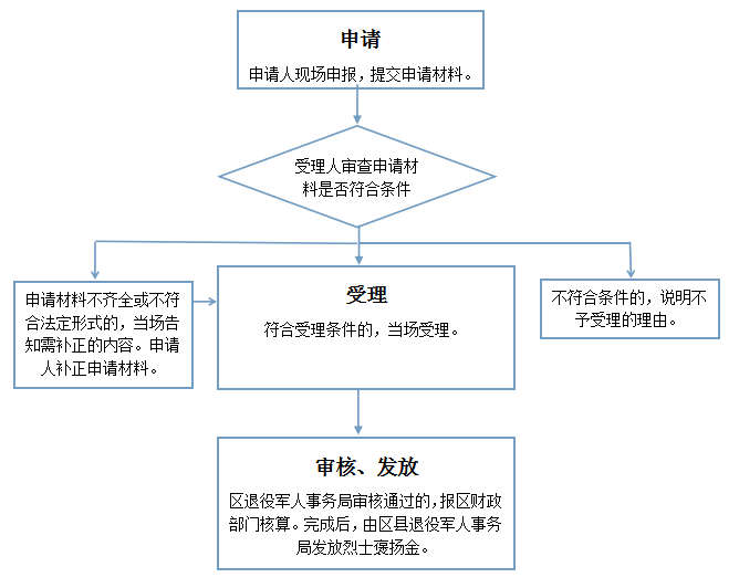 (一)申请:申请人持相关材料向区退役军人事务局提出申请。 (二)受理:区退役军人事务局审查材料,对符合条件的,当场受理。不符合条件的,说明不予受理的理由。 (三)审核、发放:区退役军人事务局审核通过的,报区财政部门核算。完成后,由区退役军人事务局发放烈士褒扬金。 |