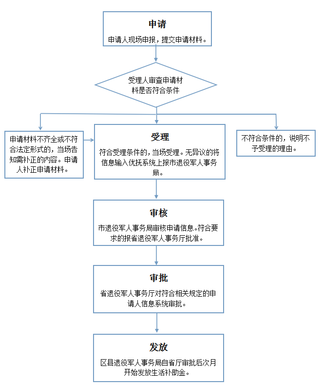 (一)申请:申请人持个人身份证,户口簿,烈士证明书、军人因公牺牲证明书、军人病故证明书或错杀被平反人员平反证明材料等相关材料向户籍所在社区、村退役军人服务站提出申请。 (二)受理:各级退役军人服务站核查申请材料,符合条件的,上报区退役军人事务局。对不符合条件的,告知申请人不予受理由。 (三)初审:区退役军人事务局组织专人审查材料并调查核实,对符合相关规定的申请人,将信息输入优抚系统上报市退役军人事务局。 (四)审核:市退役军人事务局审核申请信息,对符合相关规定的申请人,系统审核上报省退役军人事务厅。 (五)审批:省退役军人事务厅对符合相关规定的申请人信息系统审批。 (六)发放:区退役军人事务局自省厅审批后,次月开始发放生活补助金。 |