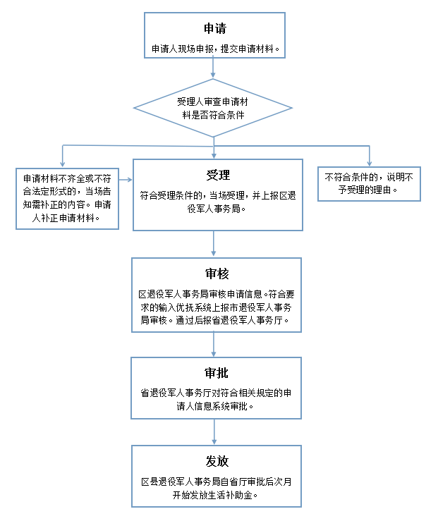(一)申请:申请人持个人身份证,户口簿等相关材料向户籍所在社区、村退役军人服务站提出申请。 (二)受理:各级退役军人服务站核查申请材料,符合条件的,上报区退役军人事务局。对不符合条件的,告知申请人不予受理由。 (三)初审:区退役军人事务局组织专人审查材料并调查核实,对符合相关规定的申请人,将信息输入优抚系统上报市退役军人事务局。 (四)审核:市退役军人事务局审核申请信息,对符合相关规定的申请人,系统审核上报省退役军人事务厅。 (五)审批:省退役军人事务厅对符合相关规定的申请人信息系统审批。 (六)发放:区退役军人事务局自省厅审批后,次月开始发放生活补助金。 |
