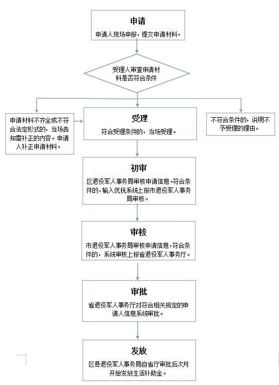 (一)申请:申请人持个人身份证,户口簿等相关材料向户籍所在社区、村退役军人服务站提出申请。 (二)受理:各级退役军人服务站核查申请材料,符合条件的,上报区退役军人事务局。对不符合条件的,告知申请人不予受理由。 (三)初审:区退役军人事务局组织专人审查材料并调查核实,对符合相关规定的申请人,将信息输入优抚系统上报市退役军人事务局。 (四)审核:市退役军人事务局审核申请信息,对符合相关规定的申请人,系统审核上报省退役军人事务厅。 (四)审批:省退役军人事务厅对符合相关规定的申请人信息系统审批。 (五)发放:区退役军人事务局自省厅审批后,次月开始发放生活补助金。 |