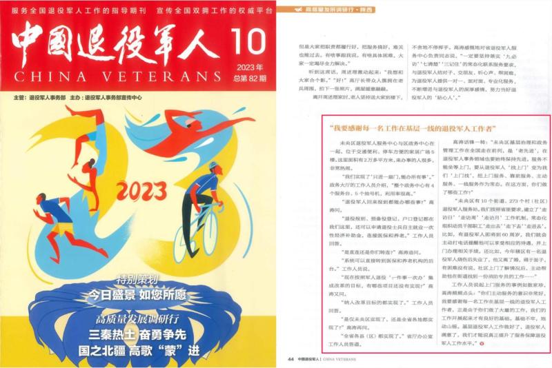 近日,《中国退役军人》刊发了“我要感谢每一名工作在基层一线的退役军人工作者”一文,对陕西省退役军人事务厅党组书记、厅长高涛到未央调研工作纪实进行了报道,未央区退役军人事务工作被厅长点赞。