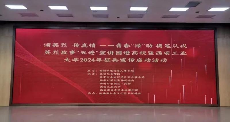我们一生会推开很多扇门,每扇门后,都可能会有意想不到的风景。今天,你的面前有这样一扇门,走进这扇门,为人生留下珍贵的记忆;穿过这扇门,在寂寞的坚守中让青春闪光……火热军营,精彩人生!2023年11月30日,由西安市退役军人事务局、西安烈士陵园、西安市英烈褒扬促进会、西安市未央区退役军人事务局、西安工业大学、未央区人武部、未央湖街道办事处共同组织开展“颂英烈 传真情”——青春“绿”动 携笔从戎 英烈故事“五进”宣讲团进高校暨西安工业大学2024年征兵宣传启动会。该校300余名学生参加了活动。