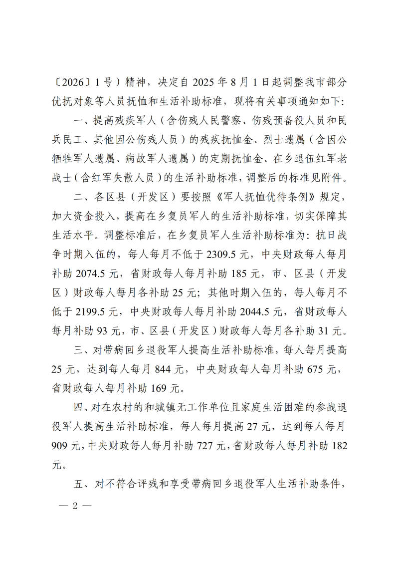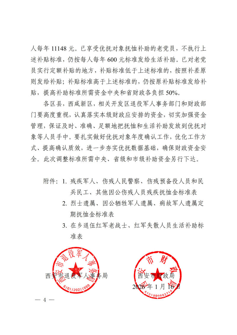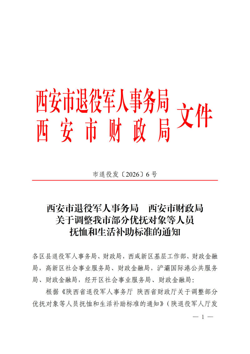 西安市退役军人事务局西安市财政局关于调整我市部分优抚对象等人员抚恤和生活补助标准的通知(市退役发〔2026〕6号)