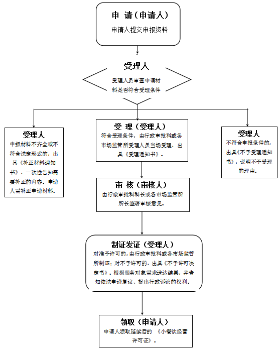 1.申请人提交申报资料→2.受理人审查资料→3.现场核查(需要现场核查的事项,如没有,不需现场核查)→4.审核人审核→5.审批人审批→6.制证发证