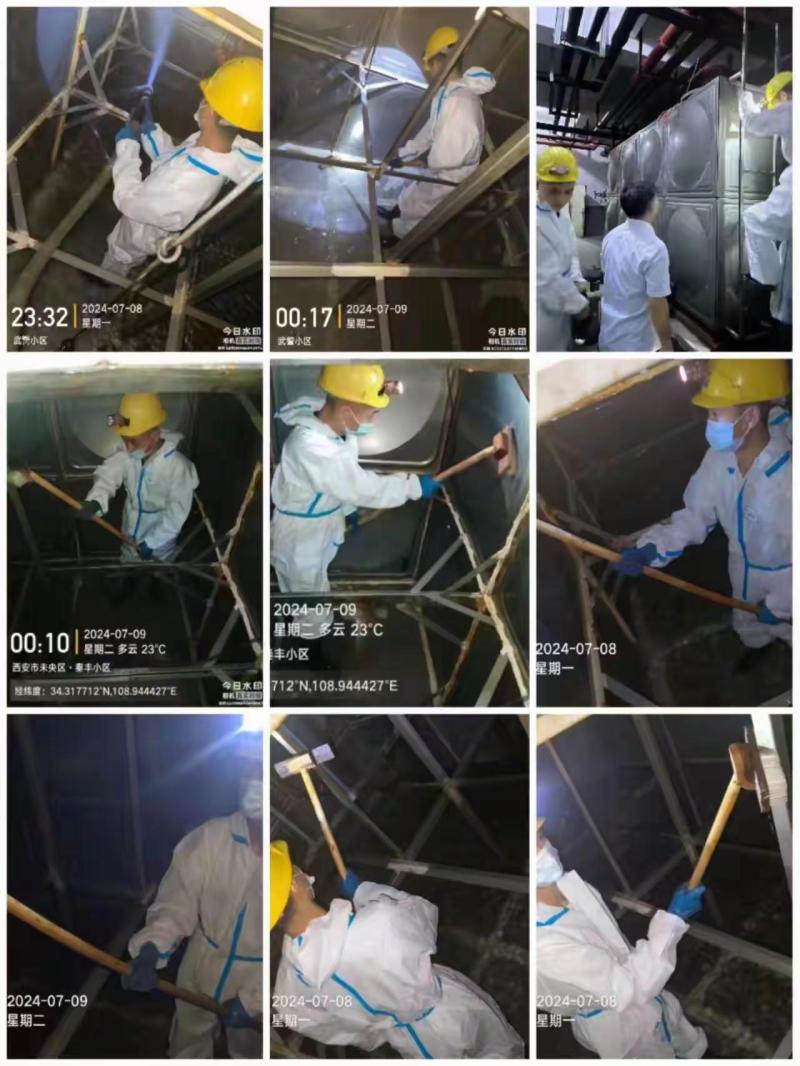 为确保居民生活用水的质量安全,防止饮用水二次污染,2024年7月9日,大明宫街道时代社区联系专业水箱清洗服务机构,对武警小区内水箱进行了全面细致的清洗,从源头上保障水质的纯净与卫生。