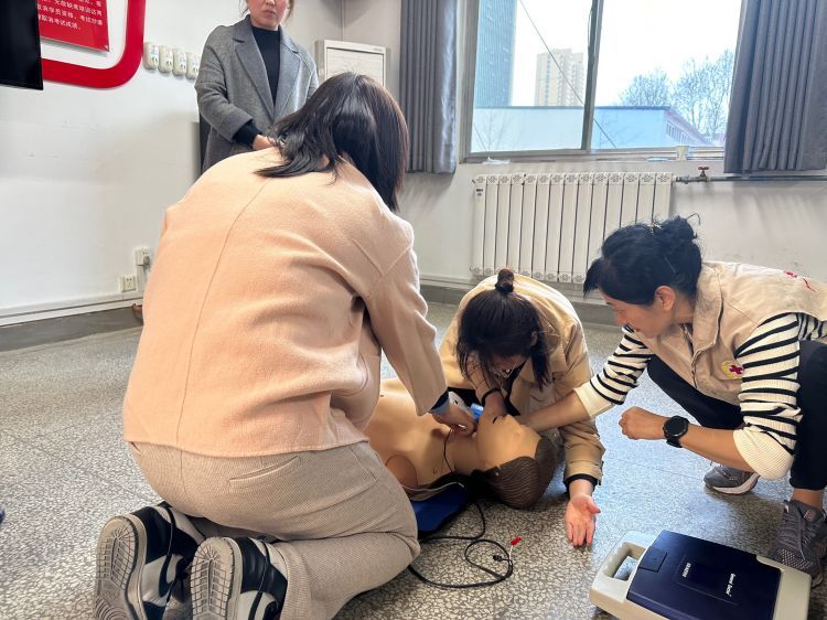为了确保此次培训质量,提高实践水平,培训老师现场进行实操演示并讲解操作要点,参训人员借助模拟人分批进行心肺复苏和AED抢救实操练习,老师及志愿者逐一纠正指导,进一步规范步骤和手法。