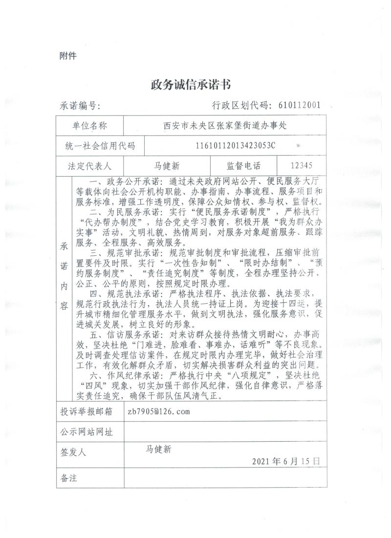 西安市未央区张家堡街道办事处2021年度政务诚信承诺书