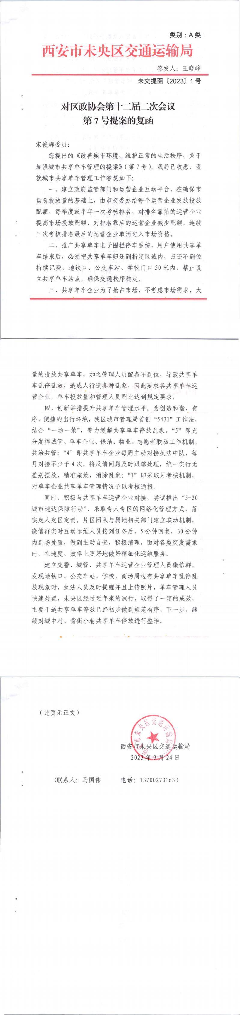 西安市未央区交通运输局关于对政协西安市未央区委员会第十二届第二次会议第7号提案的复函