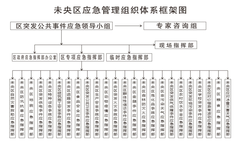根据突发公共事件的分类,区应急领导小组下设24个突发事件专项应急指挥部(以下简称专项指挥部),分别是:未央区自然灾害救助应急指挥部、未央区防汛抗旱应急指挥部、未央区地震应急指挥部、未央区突发供电事件应急指挥部、未央区特种设备事故应急指挥部、未央区建筑施工安全事故应急指挥部、未央区道路突发事件应急指挥部、未央区食品安全应急指挥部、未央区突发公共卫生事件应急指挥部、未央区生产安全事故应急指挥部、未央区动物疫情应急指挥部、未央区突发火灾事故应急指挥部、未央区群体性信访事件应急指挥部、未央区金融事件应急指挥部、未央区森林防灭火应急指挥部、未央区危化品事故应急指挥部、未央区重污染天气应急指挥部、未央区突发供气供暖事件应急指挥部、未央区农村饮水安全应急指挥部、未央区突发环境污染事件应急指挥部、未央区学校突发事件应急指挥部、未央区应对价格异常波动应急指挥部、未央区粮食应急指挥部、未央区应对冰雪灾害天气应急指挥部。