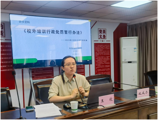 会议由陕西维谨律师事务所王欣律师从违法行为和法律责任、处罚的实施、处罚的程序三个方面带领与会人员对《校外培训行政处罚暂行办法》进行了研读,逐条解读了《办法》六大章44条内容。